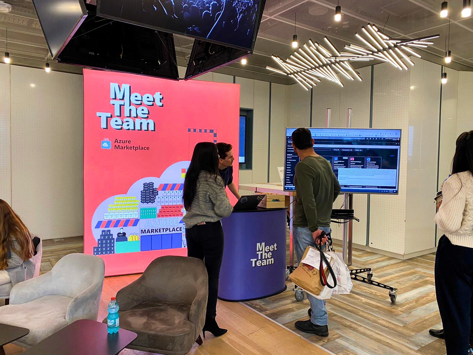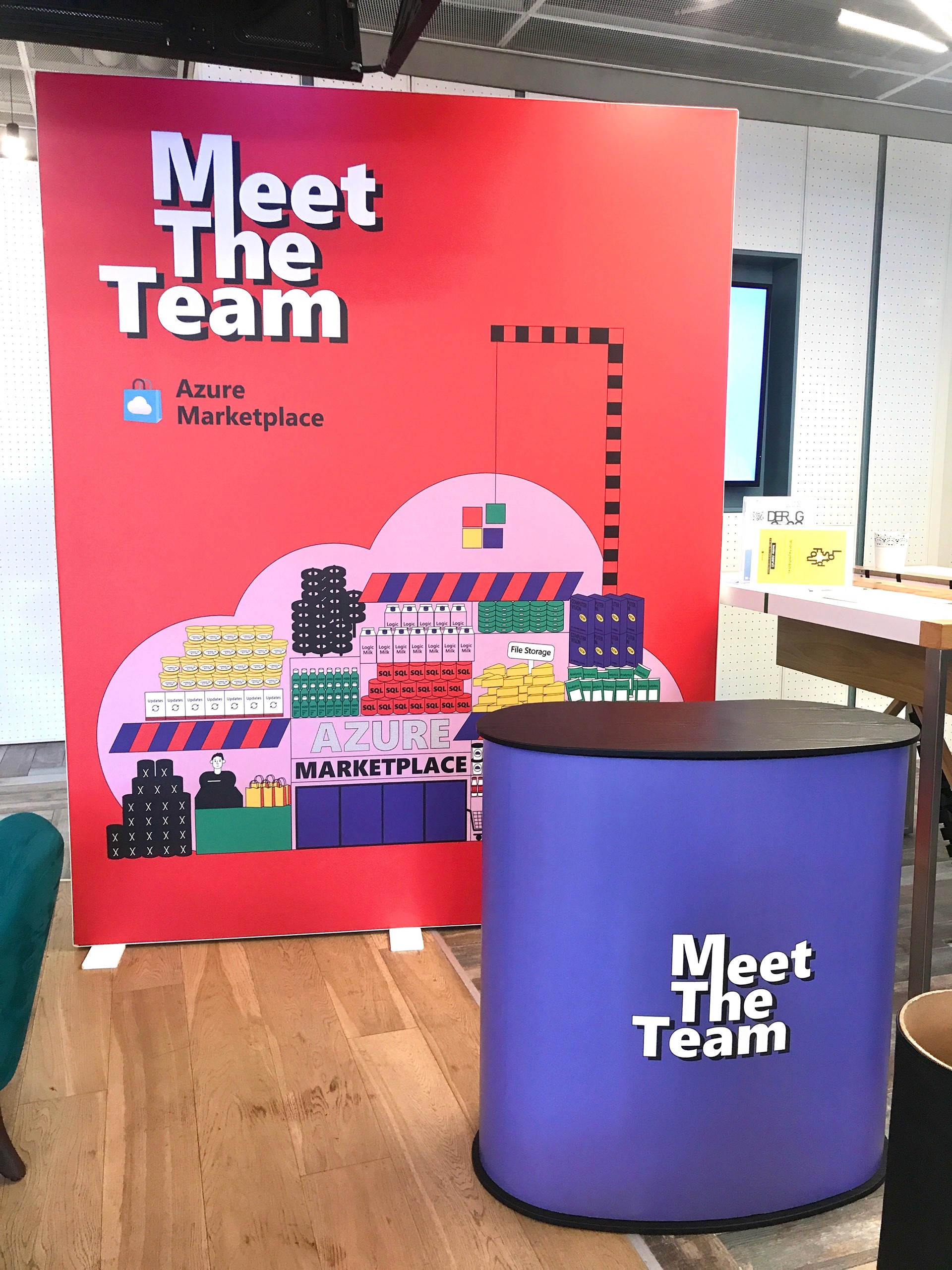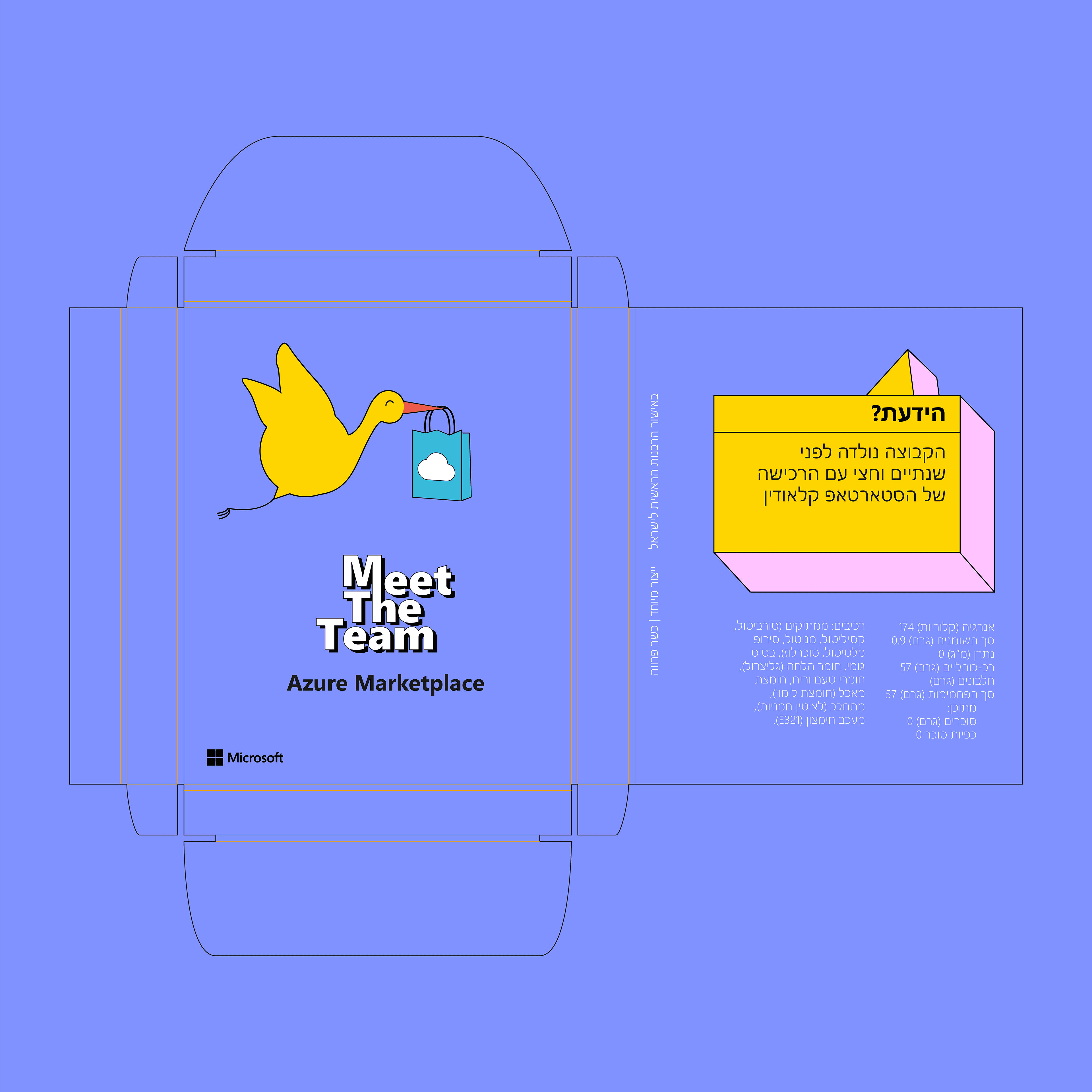 Illustration for the “Azure Marketplace” team as part of the internal “Meet the Team” campaign. This initiative helped Microsoft R&D Israel employees discover the different groups across the organization. We created a dedicated stand that invited people to stop by, learn about the team’s mission, and spark new collaborations. As part of the experience, we handed out branded gum packs that shared fun facts and key insights about the group. I illustrated the Azure Marketplace team and designed the visual language that tied the entire activation together.