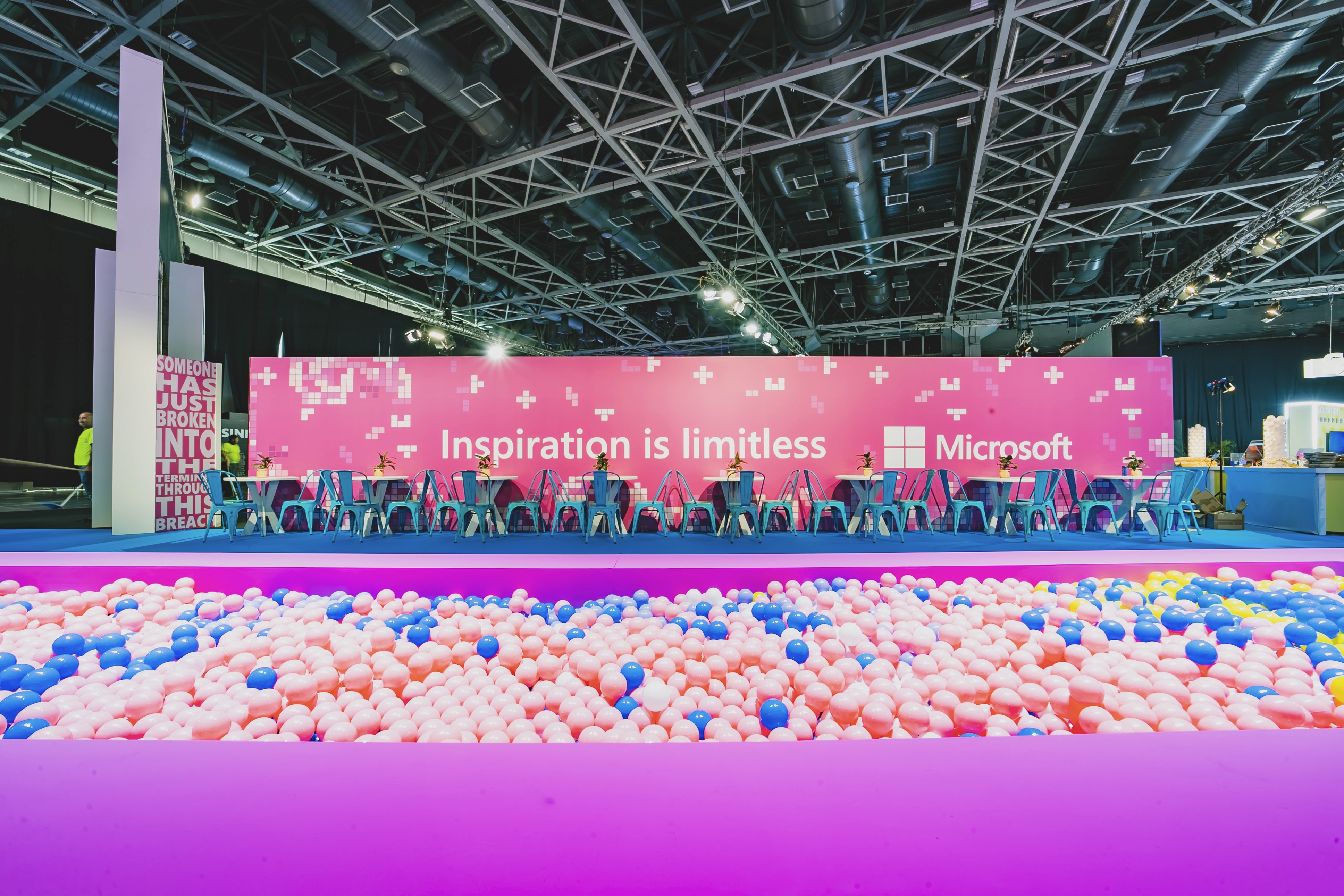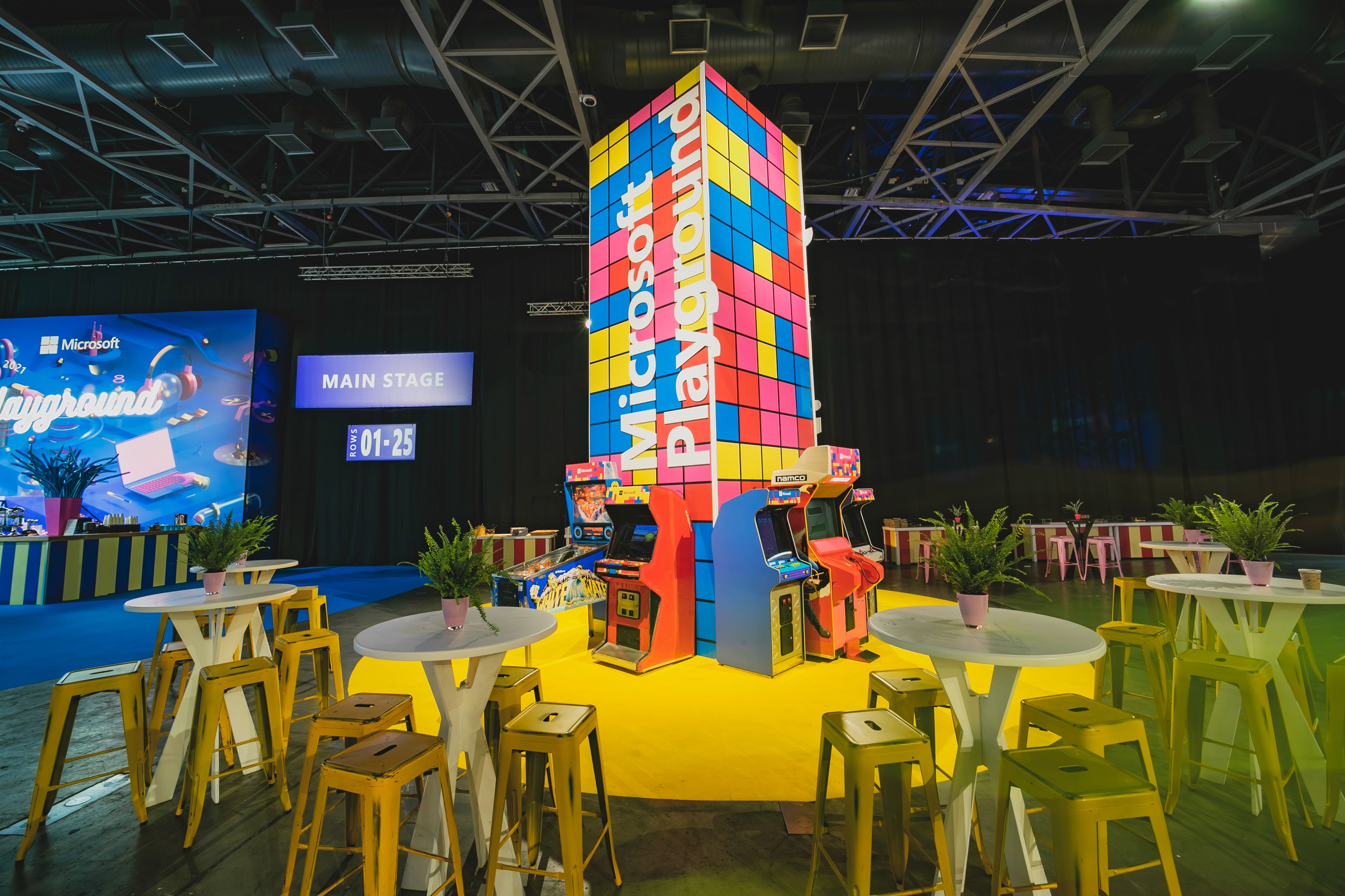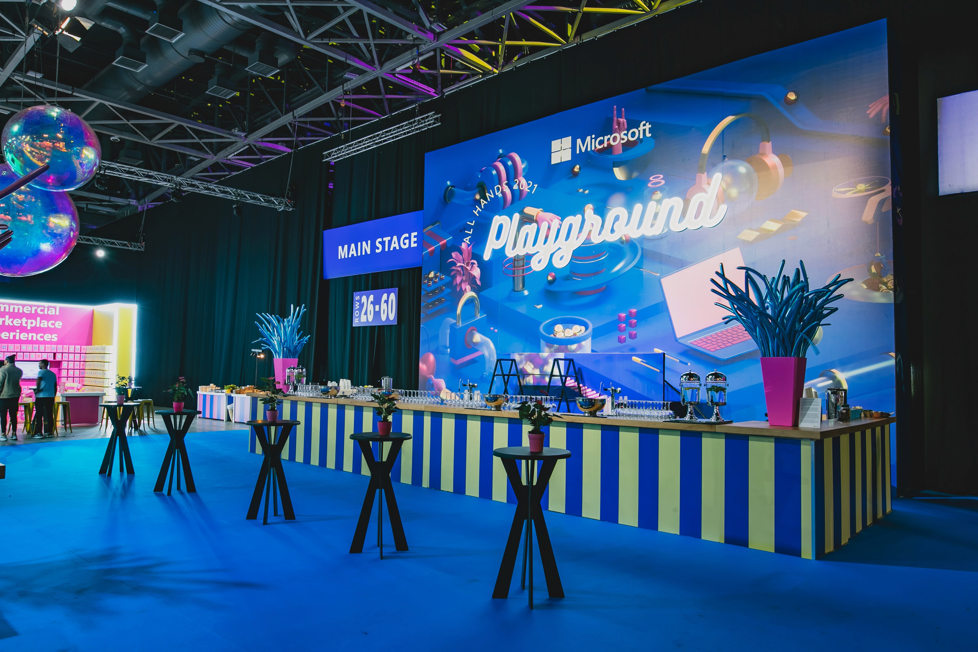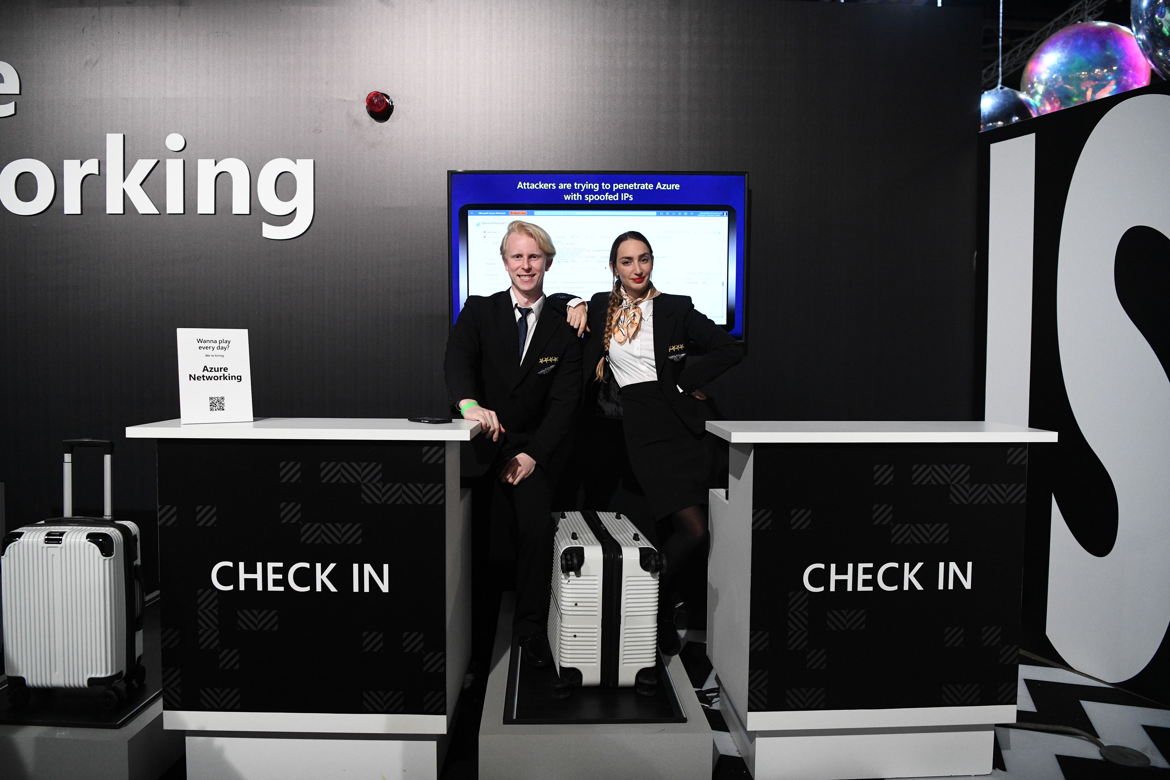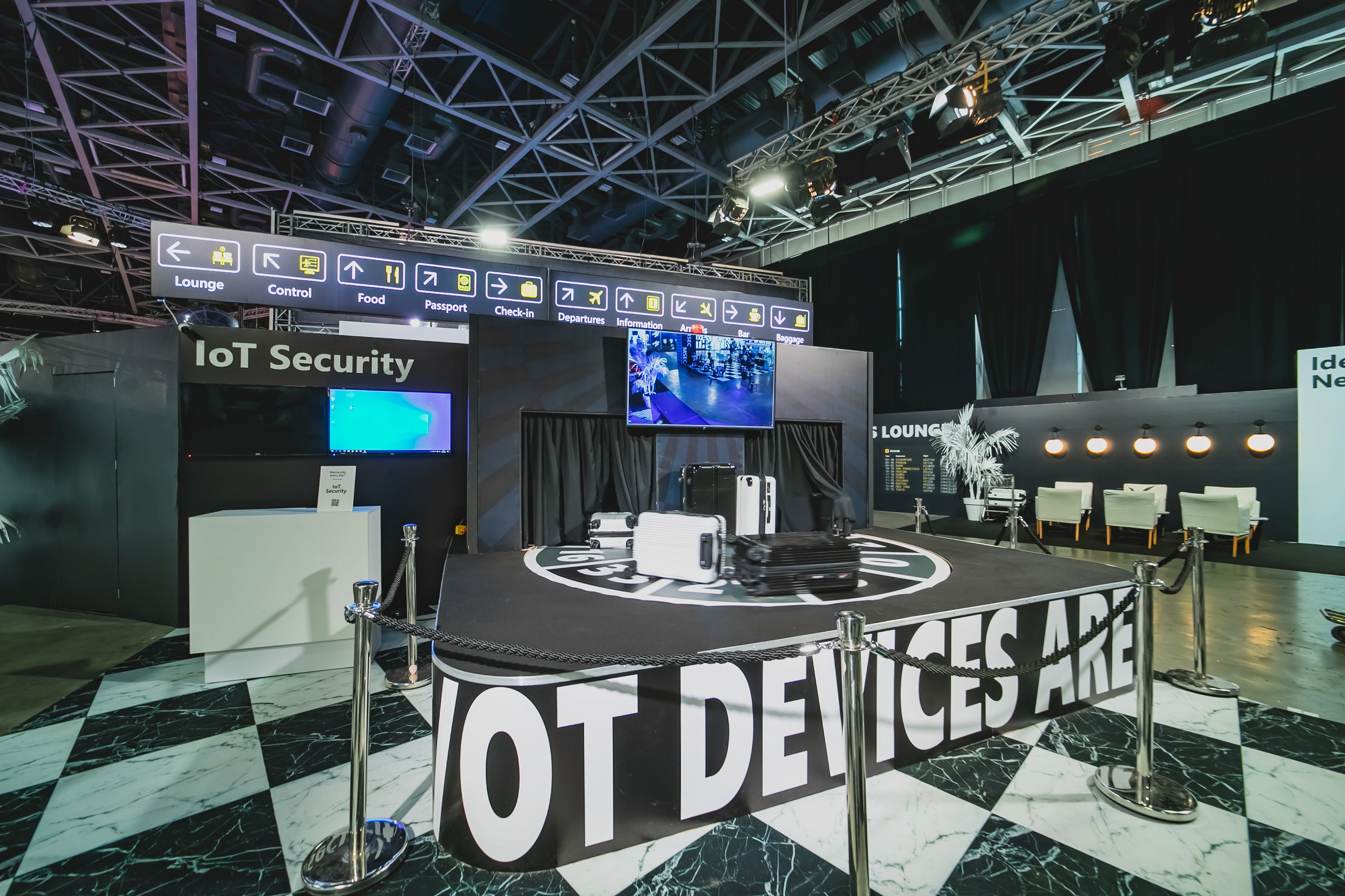 Microsoft hosted a one‑of‑a‑kind tech expo showcasing interactive product demos for ILDC employees, the local high‑tech community, potential hires, and key partners. The goal was to create an experience that anyone could understand and connect with. By designing an interactive, narrative‑driven space, we were able to communicate each group’s purpose and daily work in a way that felt accessible and engaging. Microsoft touches so many parts of everyday life — health, education, media, devices, finance, marketing, productivity, and more — so each booth was built around the unique story of its group. Using the Playground visual language, the booths were reimagined with a bold, playful, and inviting look. All security‑related groups were placed in a dedicated “airport zone,” staged as if under a simulated cyberattack. To differentiate this area from the rest of the expo, the entire zone was designed in black and white, with walls covered in bold typography and geometric patterns to reinforce the narrative and guide visitors through the space. Each group demonstrated its work through familiar real‑world scenarios — for example, a compromised baggage conveyor system illustrated challenges solved by the IoT security team.