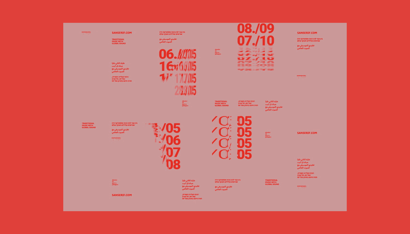 Music live shows branding and identity design. "Sanserif" is a place for Oriental-Ethnic-Global-Modern music live shows. The artists creates new music that inspired by their traditional past. The branding made by typography only and use 3 different languages that connect together in order to deliver the brand message. The logo structure uses the integration between serif and sans-serif letters which leads to literally wise logo. The grid and the layout in the posters gets complicated as the format grows. The design question the forbidden boundaries in design and experiment new typography aesthetic.