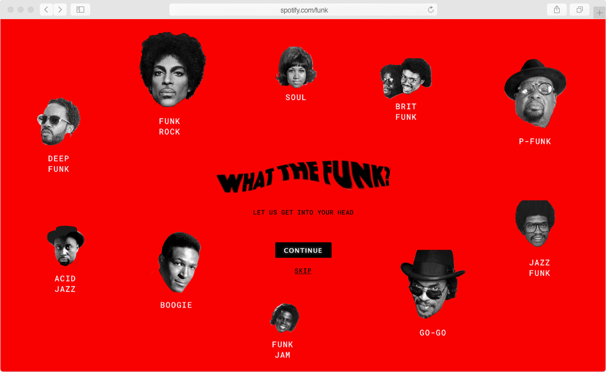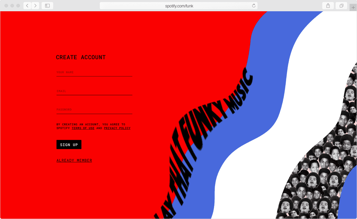 A registration form for a musical streaming service powered by Spotify. This project is all about one genre - funk. The brief was to design a formal process while providing interesting information about the service through the design. The form collects the user’s personal details with teasers from the experience he is about to get in.